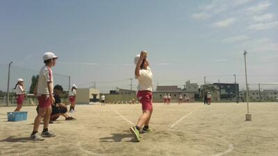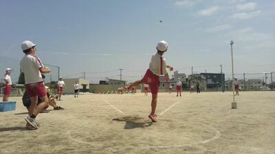 校庭では6年生が新体力テストの計測中(ボール投げ)でした。