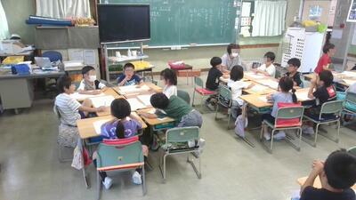 1年生の教室では「おおきなかぶ」の音読劇を計画中のようです。配役を決めるために、グループで話し合っていました。