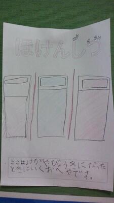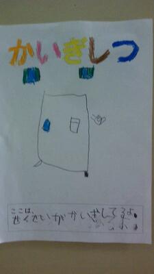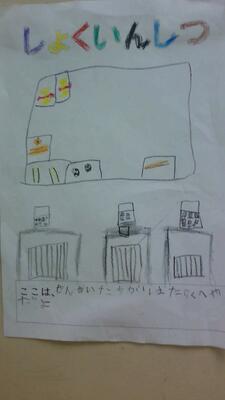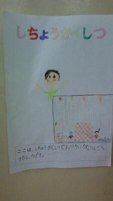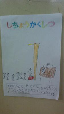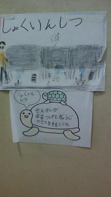 話は変わって、2年生が「学校探検」のために掲示した、それぞれの部屋の案内イラストが目に入りました。一部をご紹介。