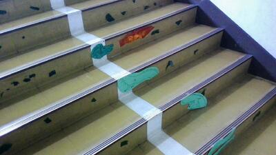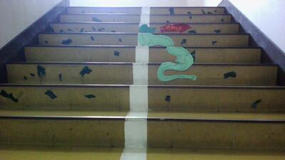 廊下を歩いていたら、階段に何かが貼ってありました。