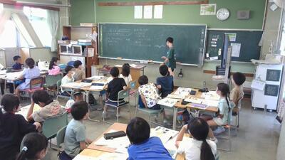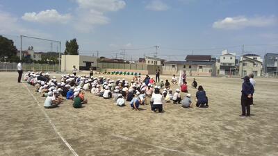 お昼過ぎの校庭はWBGT値で32℃を超え【運動中止】のレベルに。一次避難後即時の校庭への退避は行わず、教室で振り返りを行いました。