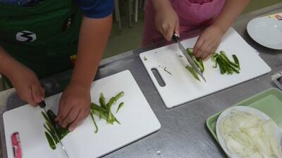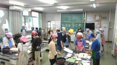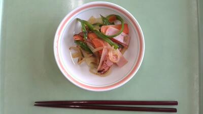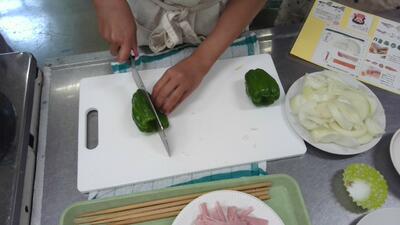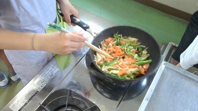 今日の課題は「切り方、順序、火加減に着目し炒めてみよう」です。ピーマン、玉ねぎ、にんじん、ハムで野菜炒めを調理しています。