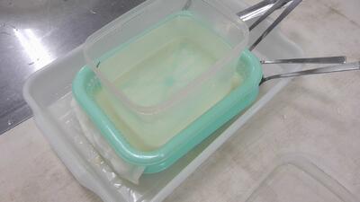 程よく温めた豆乳ににがりを加えて・・・「おおぉ、かたまっている」「とうふだ」