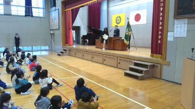 2学期は「九九」を頑張ったこと。3学期は、2学期にできなかった係活動を、もっと取り組みたいこと。新しいイベントにも工夫して取り組みたいこと。聴き取りやすい話し方で、姿勢正しく立派に発表しました。