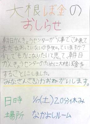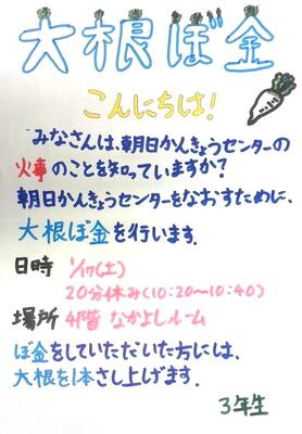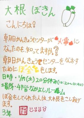 【お知らせ】1月17日に募金活動を行います 投稿: admin (10:00) カテゴリー: お知らせ 3年生のみなさんからのお知らせです。 朝日環境センターの修理のために、募金活動を行います。 修理はまだ終わっていないので、少しでも力になりたいと思いました。 修理できないと、みんなが困ります。 ご協力をお願いいたします。 〇時間 1月17日 10:20~10:40〇場所 教室棟4階なかよしルーム募金していただいた方には、畑で収穫した大根を差し上げます(約100本用意しています) ゴミが処分されず見えるところに山積されていた状況が記憶にあるようです。 ご協力いただければ幸いです。 -